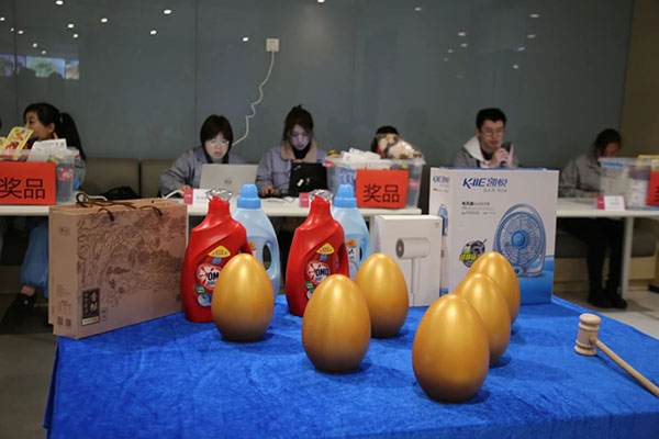 工作人員提前布置場地,在食堂的休息區(qū)掛上了滿滿的燈謎,隨著午餐后“活動開始”的一聲令下,大家蜂擁而至,在燈謎區(qū)苦苦思索和尋找。看到能猜出的燈謎,便立馬拿下,沖向兌獎區(qū)兌換小禮品,同時增加積分。隨著燈謎越來越少,活動也逐漸進入了高潮。最終,六名選手脫穎而出,獲得了砸金蛋的機會,最多的一位猜出了九條燈謎。砸金蛋,得大獎,公司為大家準備了吹風機、電風扇等獎品。