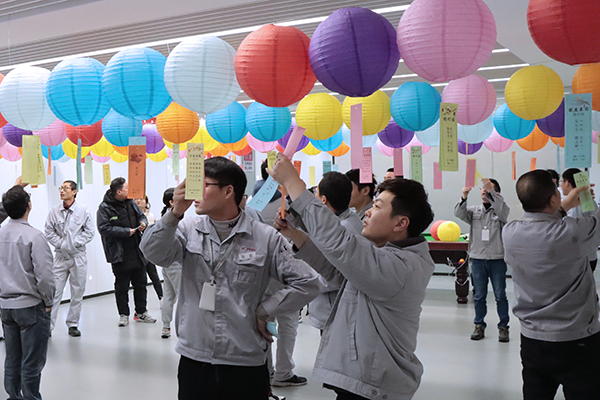 同時,猜燈謎活動也在如火如荼地進行。為了讓員工更好地參與活動,特設(shè)置了一個主會場,兩個分會場。100個彩色燈籠懸掛整齊,200條謎語相映成趣,員工們或細看謎面、或冥思苦想、或小聲討論,猜出謎底的員工歡呼雀躍地去領(lǐng)取“戰(zhàn)利品”。全場最厲害的員工猜對了15條燈謎,欣喜地將大獎收入囊中,其他員工也帶著禮品盡興而歸。