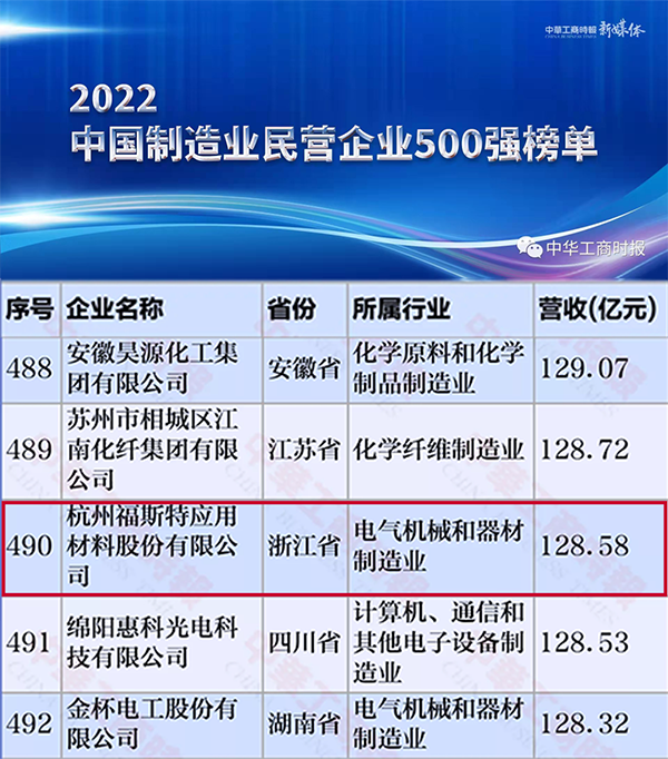 福斯特以2021年度營業收入128.58億元,首次登榜,位列第490名!
