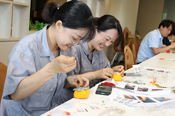 萋萋苦艾納香囊,傳承千年未泯香。我國自古就有端午佩戴香囊的傳統,清香的艾葉有避邪驅瘟、醒腦提神的功效,也有“招百福”的美好寓意。員工們自己動手縫制柿子形狀的香囊,象征“柿柿如意”,大家全神貫注,穿線、縫制、收口、定型,一個個可愛的小柿子就在手中誕生了。