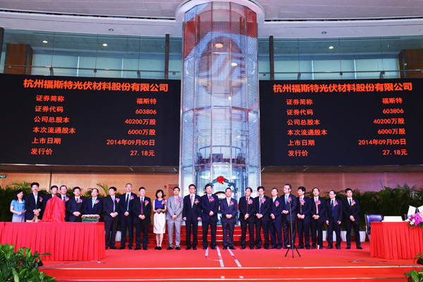 9月5日上午,杭州福斯特光伏材料股份有限公司在上海證券交易所A股主板市場成功登陸。公司本次公開發行6000萬股股票,證券簡稱:“福斯特”,證券代碼:“603806”。
