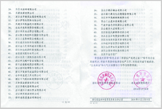 根據《浙江省創建綠色企業(清潔生產先進企業)辦法(試行)》,我公司在自主申報的基礎上,依次通過臨安市經信局、環保部門預審推薦,浙江省經信委、環保廳專家組復審及社會公示,被正式授予該榮譽稱號。