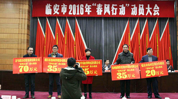 2016年1月12日下午,臨安市“春風(fēng)行動”正式啟動。啟動儀式上,福斯特與另外三家企業(yè)率先捐款,其中,福斯特本次捐款35萬元。今年是福斯特參與我市“春風(fēng)行動”的第5個年頭,累計(jì)捐款金額已達(dá)120萬元。