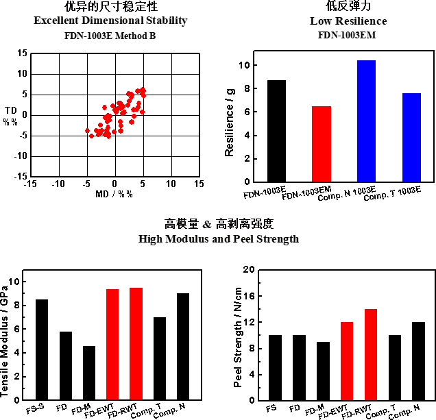 福斯特無膠型雙面板,采用自主研發的熱固性聚酰亞胺、熱塑性聚酰亞胺作為絕緣材料,經過一定的疊構設計生產得到。產品具有高剝離強度和高拉伸強度,優異的尺寸穩定性和良好的耐熱性,可用于制造高性能單面板和多層板。根據客戶端不同的應用需求與應用場景,設計了具有不同特性的產品系列。
